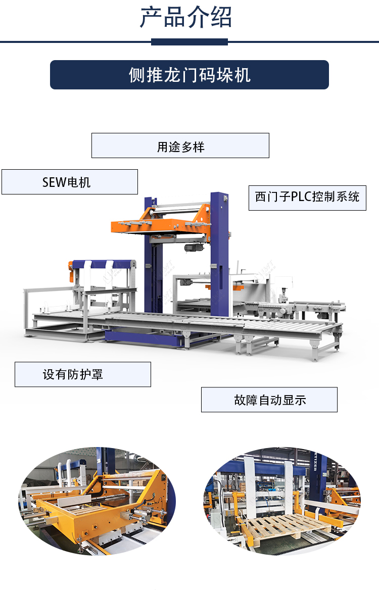龍門側(cè)推碼垛機采用西門子電控觸摸屏控制,施耐德電器元件。實現(xiàn)智能化操作管理,簡便、易掌握。可大大地減少勞動人員和降低勞動強度。