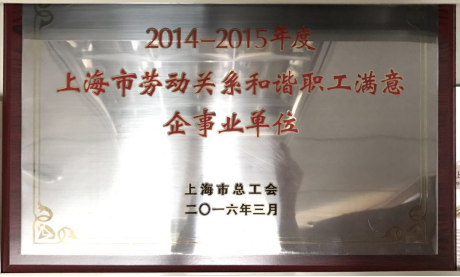 公司榮獲上海市總工會頒發(fā)“2014-2015年度勞動關(guān)系和諧職工滿意企事業(yè)單位”榮譽稱號。