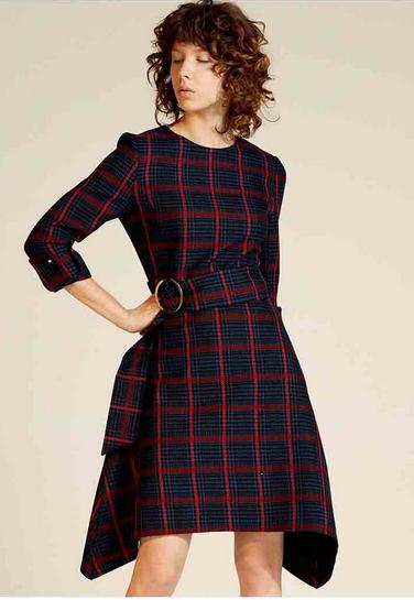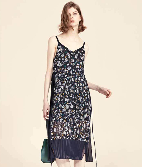連衣裙時尚大面積印花圖案,讓整條連衣裙顯得淑女優雅。下半身百褶的拼接與流蘇飄帶的設計,展現迷人少女風情